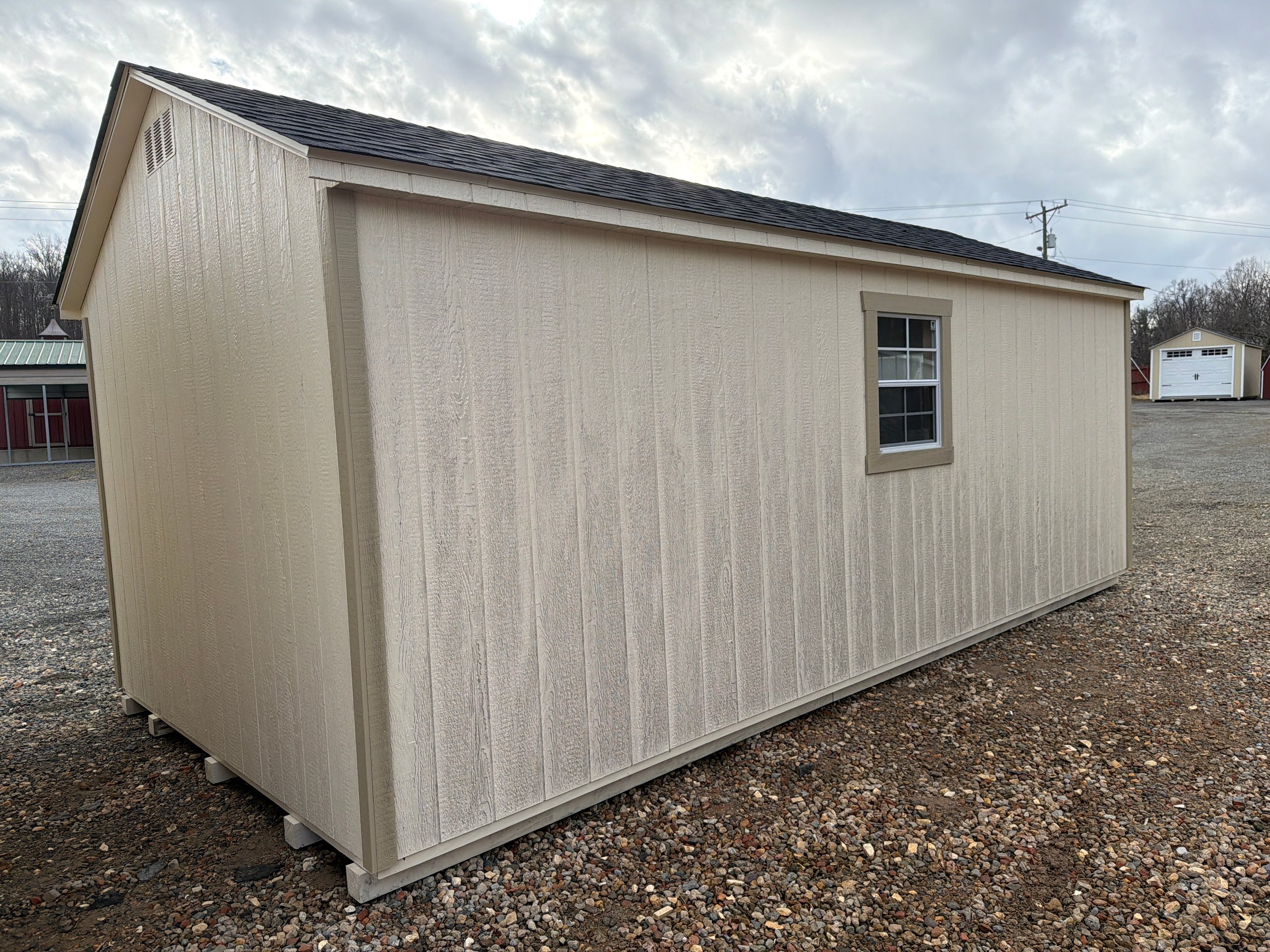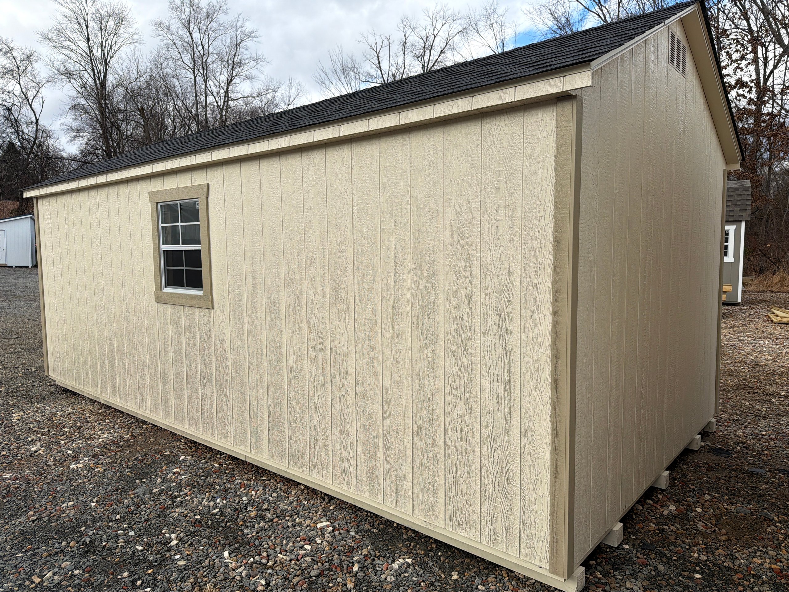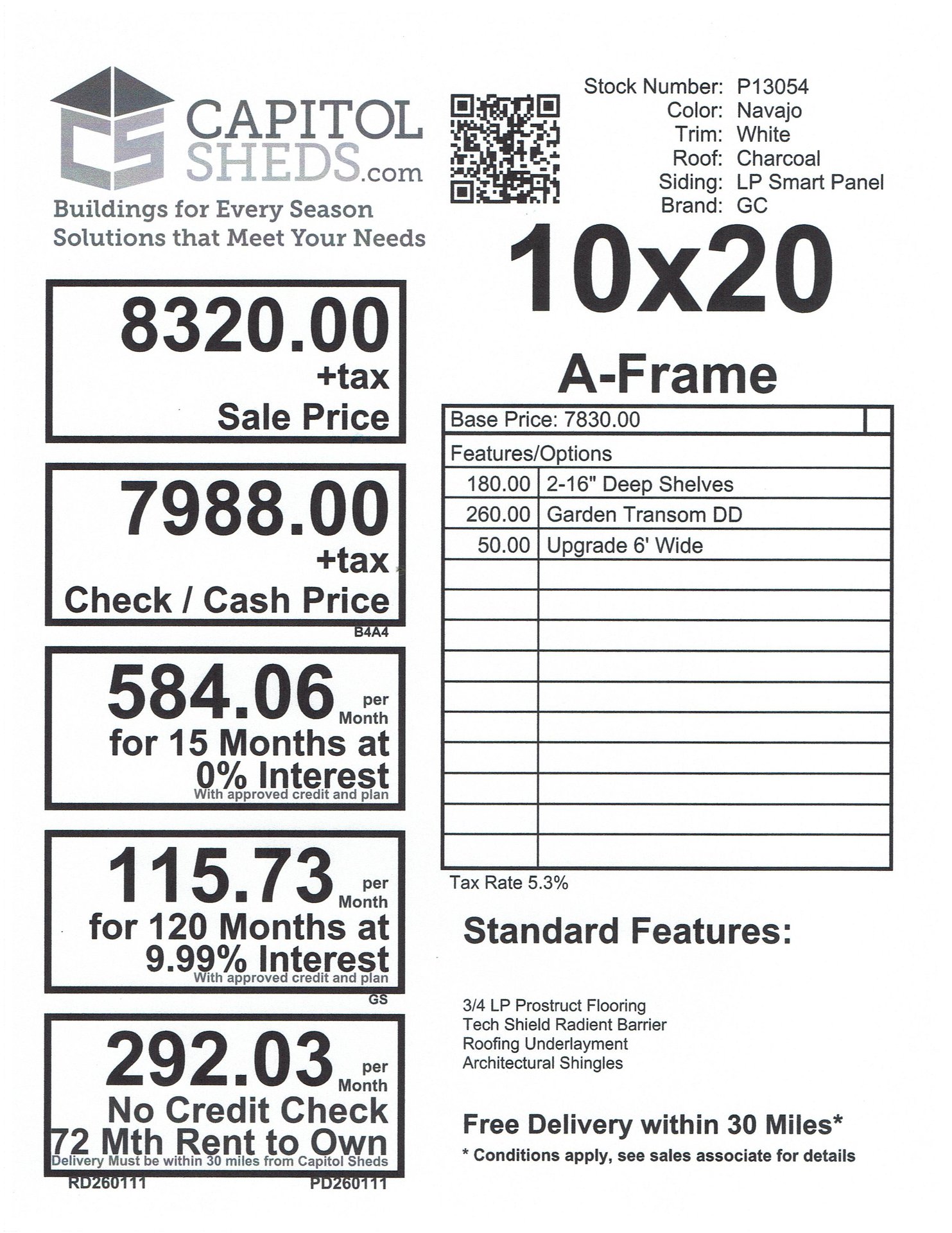 This 10×20 A-Frame shed blends timeless style with practical upgrades for everyday use. Finished in warm Navajo LP Smart Panel siding with crisp white trim and a charcoal roof, it offers an inviting, traditional appearance. Two windows provide natural light, while upgraded 6′ wide double doors with transom windows enhance both accessibility and curb appeal. Inside, durable 3/4″ LP ProStruct flooring delivers long-lasting strength, and two 16″ deep shelves add convenient storage for tools, equipment, or seasonal items. Ideal for storage, hobbies, or a workshop, this A-Frame delivers dependable performance with refined details.