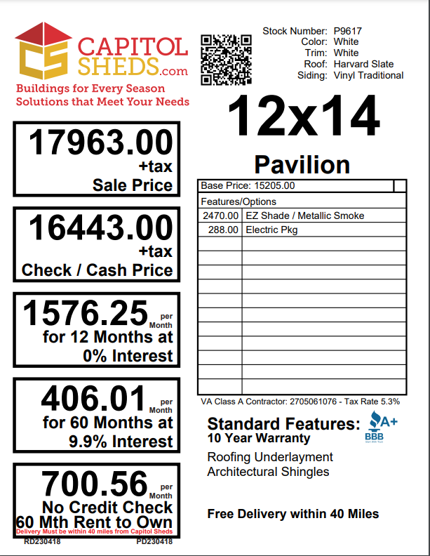 Reserve this building for a $500 deposit. Within 1 business day a rep will contact you to discuss delivery and discounts you may qualify for such as cash/check, military/1st responder, etc.