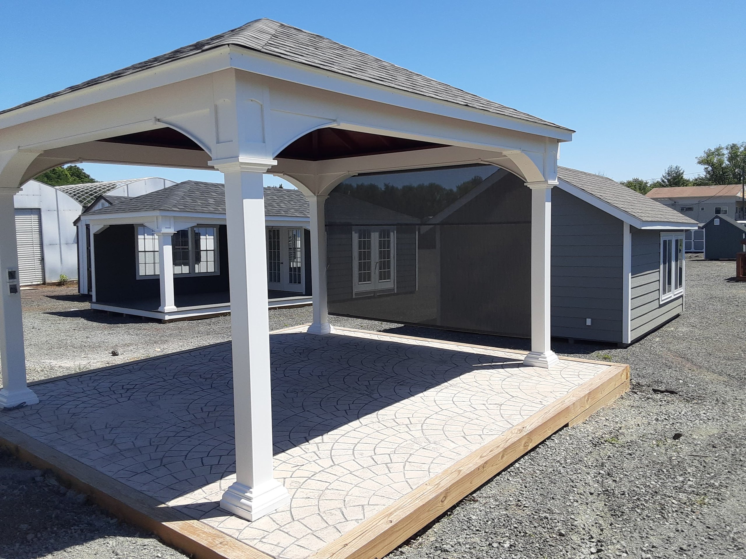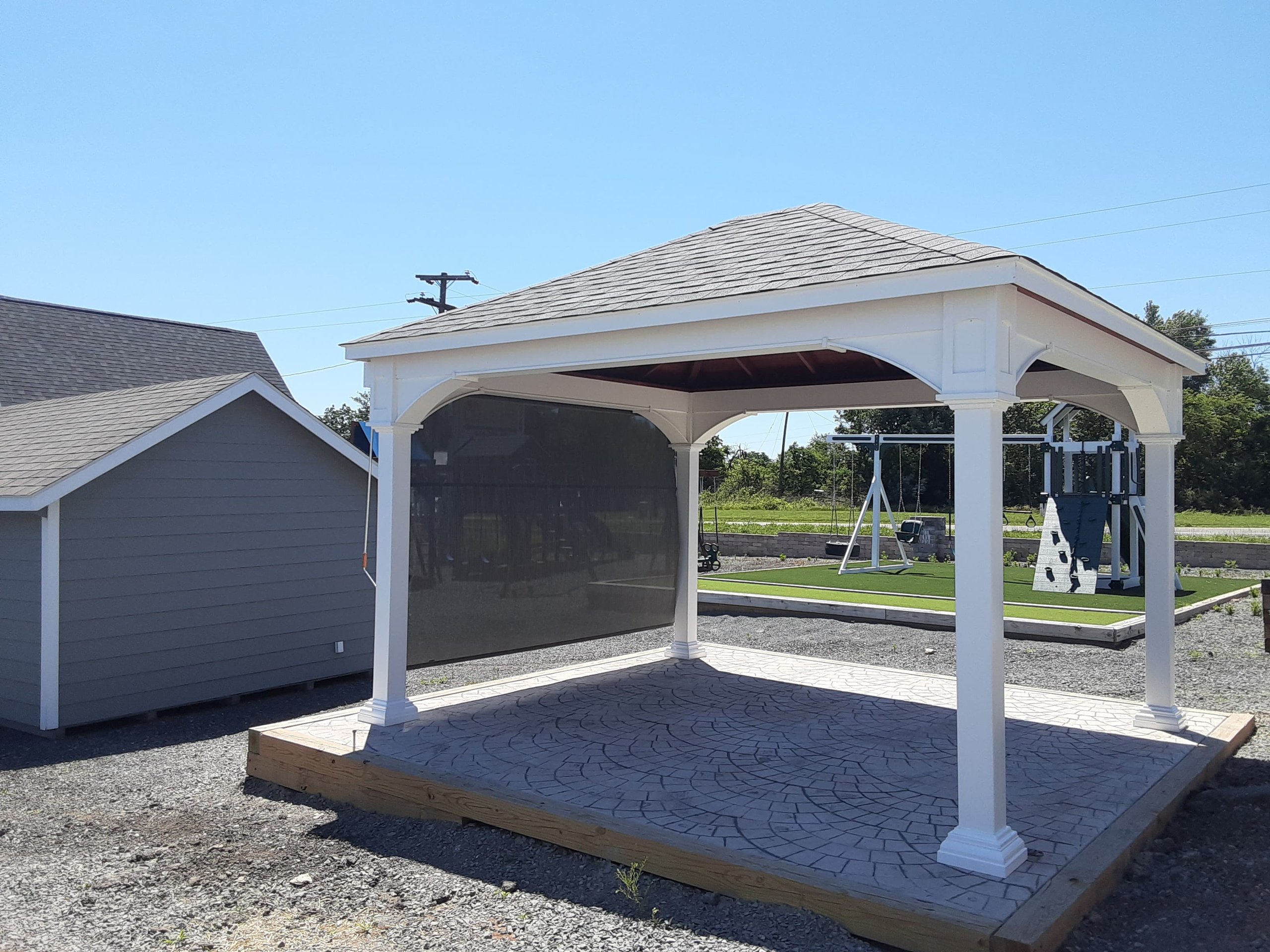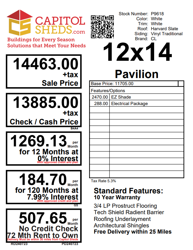 Style Name: Pavilion Size: 12×14 Siding: Vinyl Main Color: White Trim Color: White Roof Color: Harvard Slate Roofing: Shingles Roofing Underlayment: Roof Felt Wall Framing: 2×4 studs 16 inches on center Roof Framing: 2×4 rafters 16 inches on center Roof Sheeting: LP Tech Shield Upgraded Features: EZ Shade Electrical Package